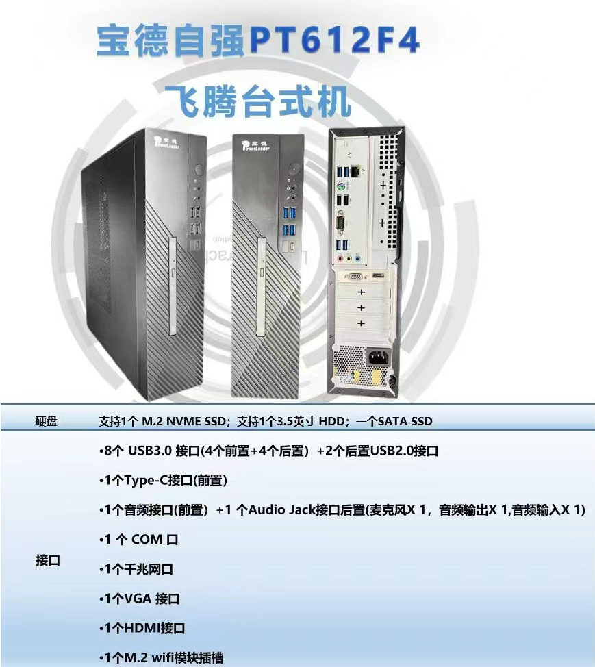 宝德自强®PT612F4是一款基于FT-D3000/8处理器的台式机产品,支持国产自主安全 BIOS 和安全可信模块,保护用户私密数据信息,既可满足政府机构及有关部门系统的需求,也可轻松应对各种商用办公环境